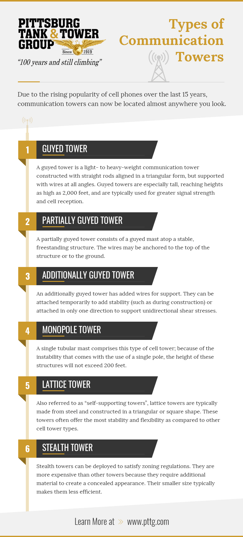 Due to the rising popularity of cell phones over the last 15 years, communication towers can now be located almost anywhere you look. However, it’s important to note that not all cell towers are the same. There are four different types of communication towers that can be used to transmit cellular signals. There are many different types of cell towers that can be installed depending on your specific purpose — the most common of which is referred to as a guyed tower.
