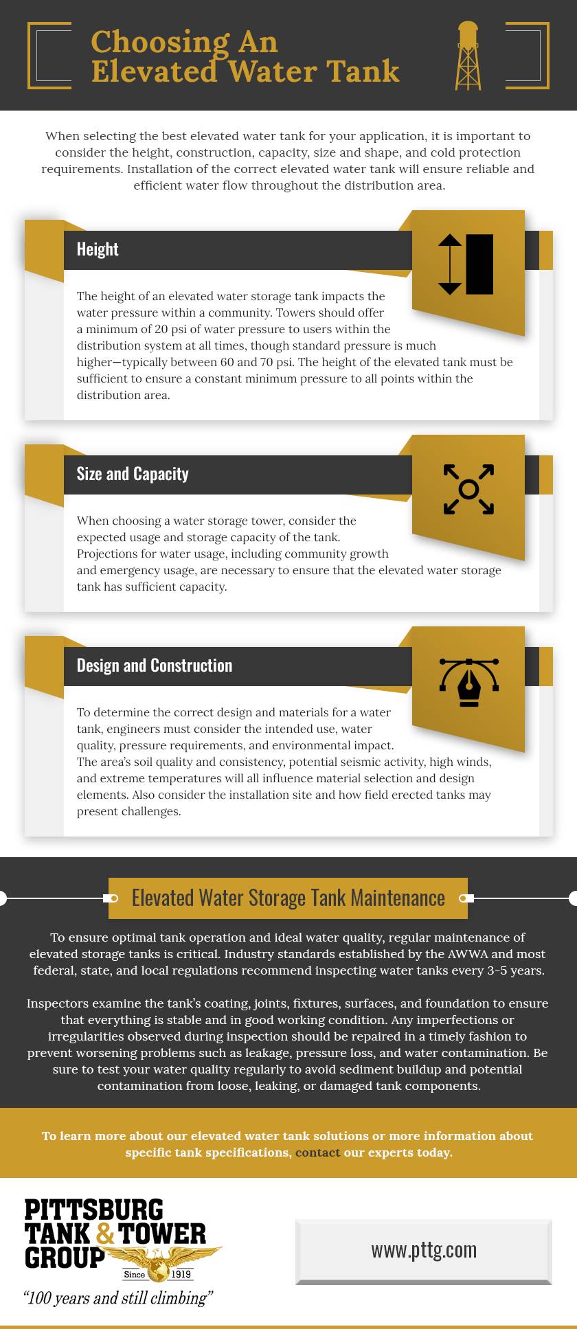 Elevated water storage tanks are used to store water for fire protection and potable drinking water within a designated area or community. Elevated tanks allow the natural force of gravity to produce consistent water pressure throughout the system. Based on the intended application and needs of the distribution area, elevated water tanks can be engineered using a broad range of shapes, sizes, and materials.